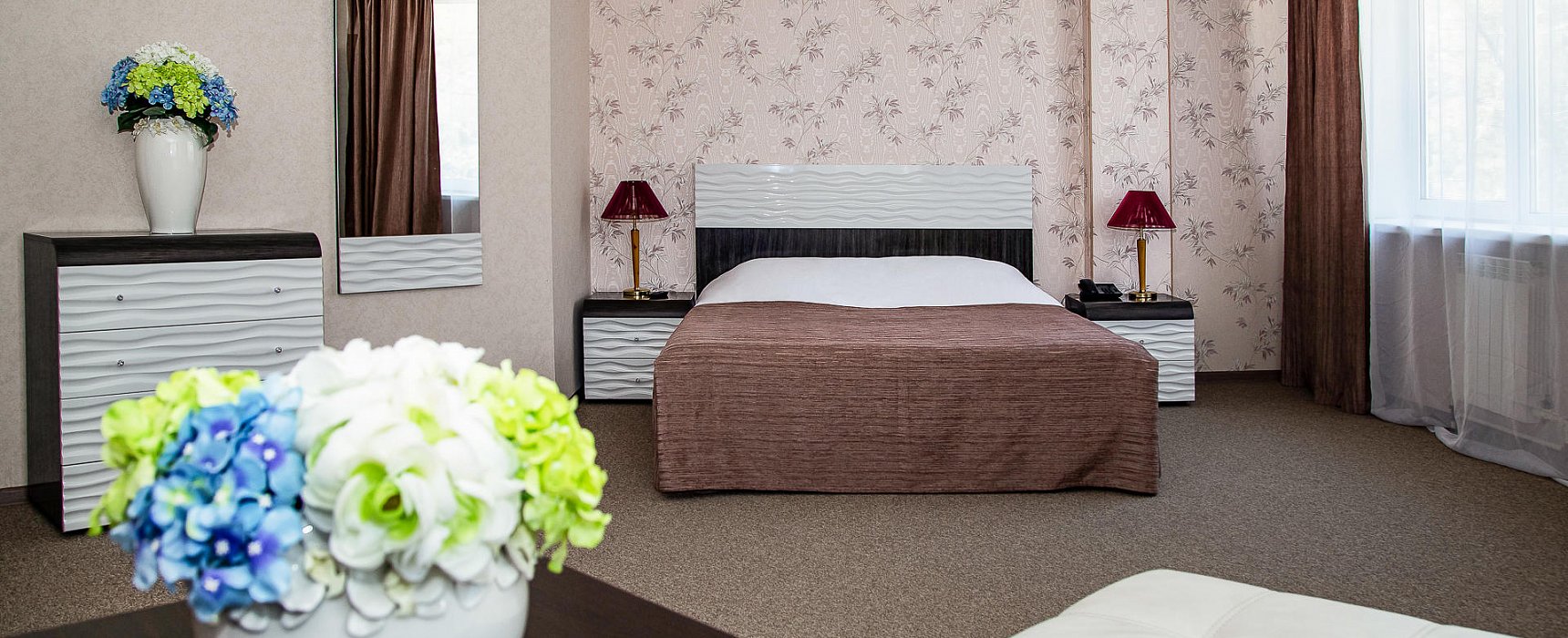 В номере: вешалка, зеркало, кровать двуспальная, прикроватные тумбочки, стол, стулья, шкаф, индивидуальная система обогрева, кондиционер, микроволновая печь, сейф, телевизор, телефон, холодильник, чайный набор посуды, электрочайник