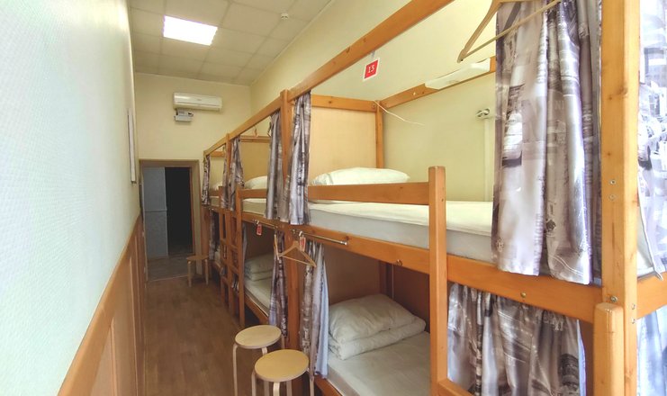 В номере: кровати двухъярусные, вешалка, зеркало, стол, табуреты, кондиционер