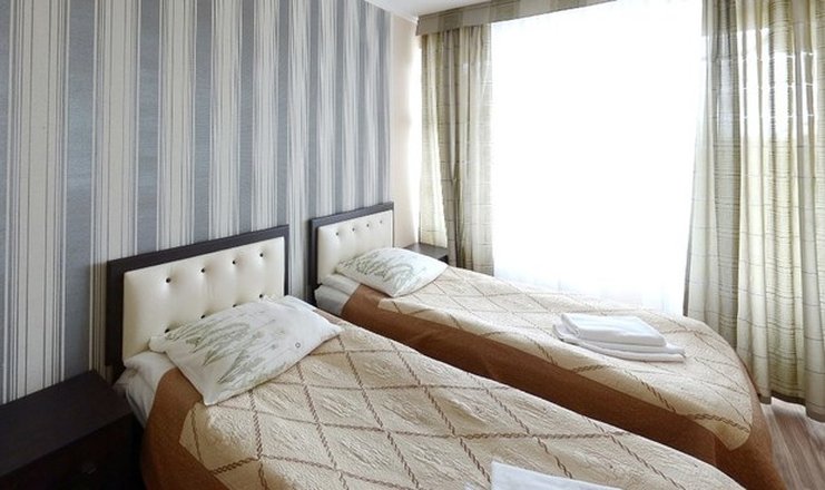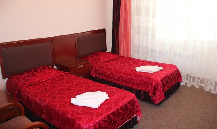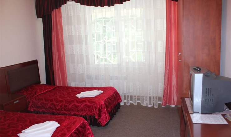 Оснащение номера: кровати односпальные, прикроватные тумбочки, стол, стулья, шкаф, телевизор, холодильник